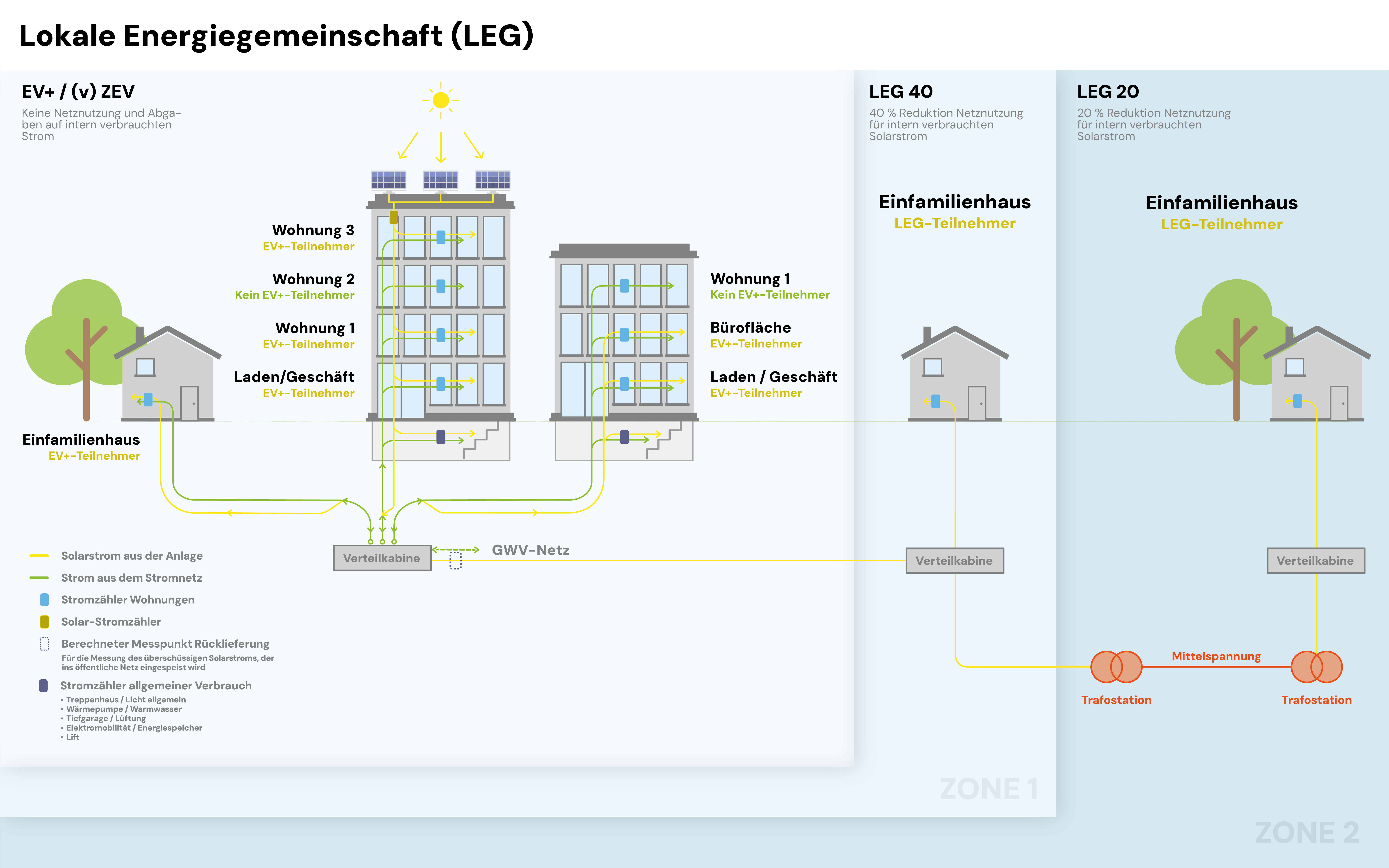 Eine Lokale Elektrizitätsgemeinschaft (LEG) ermöglicht es, im Quartier oder über die gesamte Gemeinde hinweg lokal produzierten Strom direkt zu handeln. So entsteht ein lokaler Marktplatz, auf dem sich Produzenten, Speicherbetreiber und Endverbraucher zusammenschliessen und Strom in unterschiedlichen Konstellationen austauschen können.