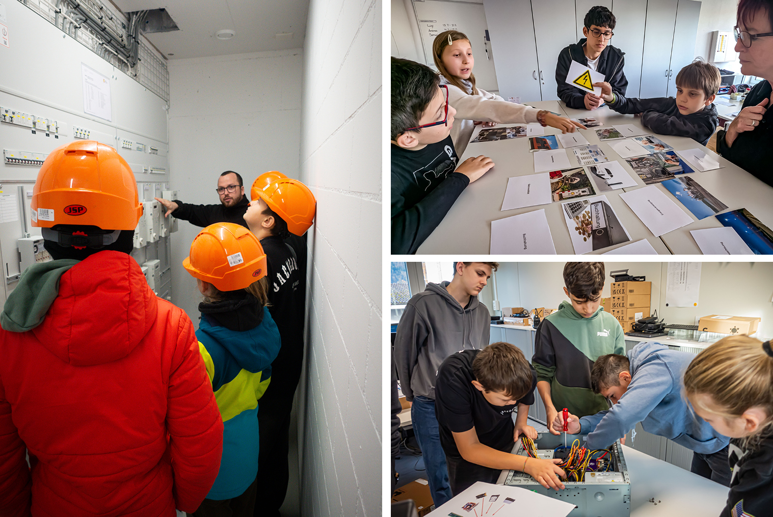 Auf der Baustelle des Mehrfamilienhauses «Sommerpark» im Ballygebiet entdeckten die Schülerinnen und Schüler die verschiedenen Elektroinstallationsarbeiten und besuchten Solaranlagen. Unser Büro-Alltag wurde den Kindern mit dem Kundensupport-Memory spielerisch nähergebracht und in der Informatik untersuchte man neugierig das Innenleben eines Computers.